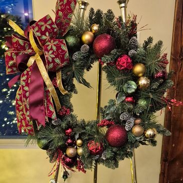 A beautiful full wreath in traditional red, green, and gold designed by Franny's Floral Boutique.