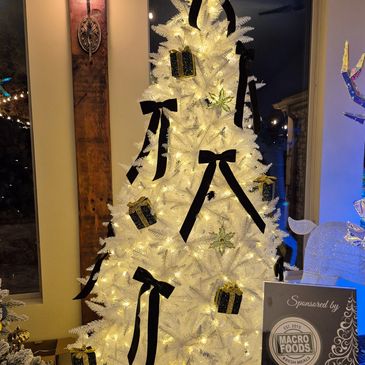 A 7 ft. green tree with white pointsetta and cream featherlike decor with gold glitter, matte & shiny baubles, finished elegantly with black bows