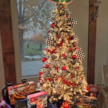 Flocked, 7.5 ft adorned with red, silver, gold & everything CARS!. Black and white racing flags & a.Cars movie blanket as a tree skirt.