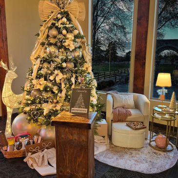Beautiful, luxurious 9.5 ft. tree from Glasshouse, Anthropologie pearl & satin bow topper, cupcakes & cashmere pearl embellished plush tree skirt. All tree ornaments, including pearl and champagne gem bows and hearts, various pics, iridescent, ivory & champagne gold baubles of different sizes from 10" to 3", 6 iridescent bauble garlands, ribbon and more! Tree also includes two gorgeous oversized ivory Christmas baubles, large white & gold-lighted reindeer, & light up snowflakes.